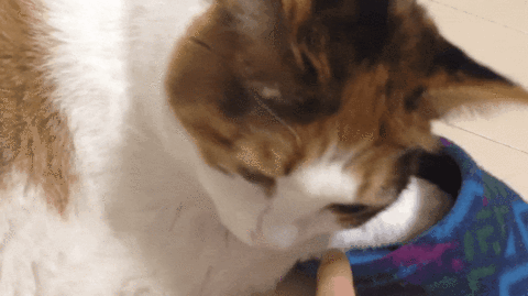 スリッパに顔をうずめる三毛ネコのこころさん。