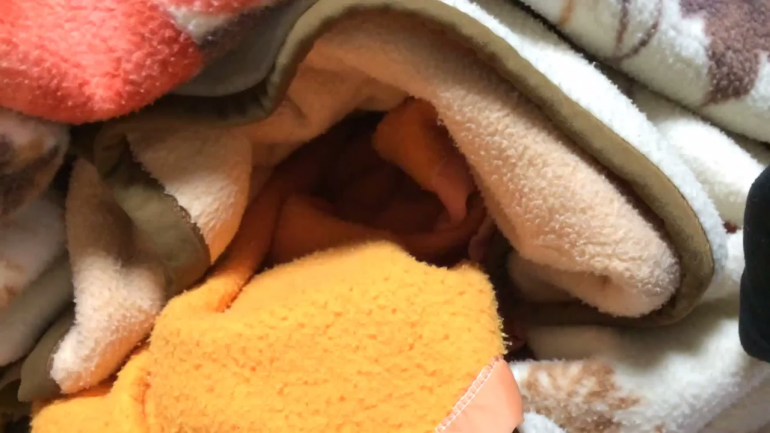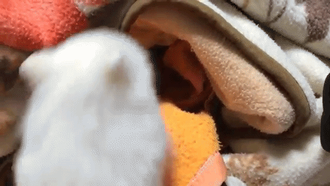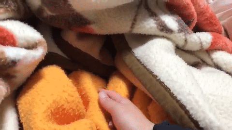 折り重なる毛布の真ん中に気になる穴がっ(゚∇゚;)
