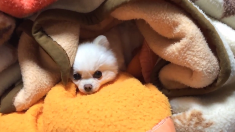 ぐりぐり~っと頭を突っ込むまっしろポメちゃん。