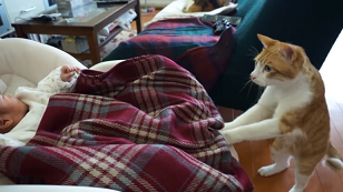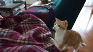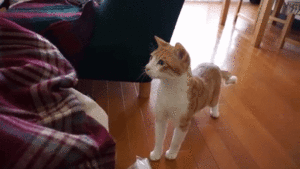 遠くからじーっととみつめる茶ねこのチコくん。