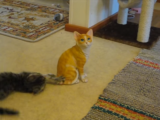 ネコの置物が気になる様子のニャンコ。