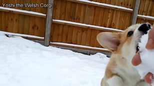 真っ白な雪をガジガジかじるヨシくん。