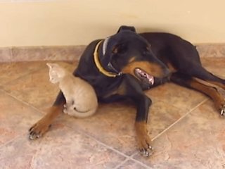 おっきなドーベルマンと、まだまだ小さい子ネコ。