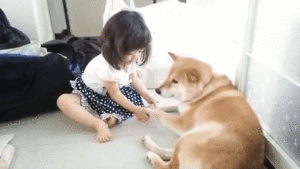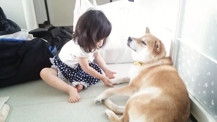 とあるお部屋で一緒に遊ぶ女の子と柴犬ちゃん。
