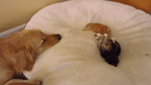 子猫たちを見つめるゴールデンレトリバー。