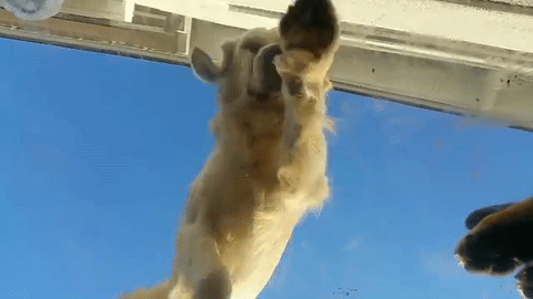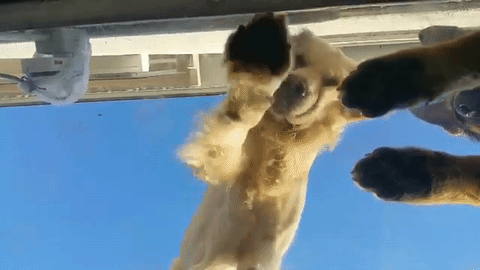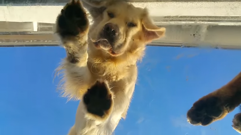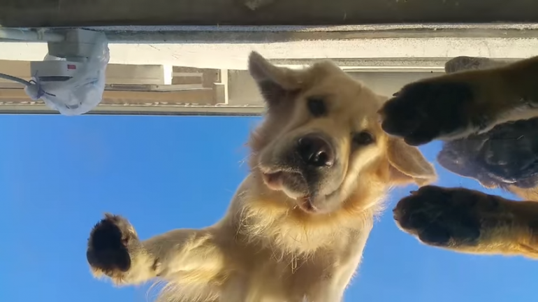 床上(?)からガラス越しにホリホリするワンちゃん。