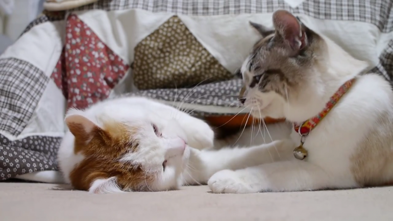 ぐっすりと眠っているしろに、くろはちょっかいをかけはじめます☆