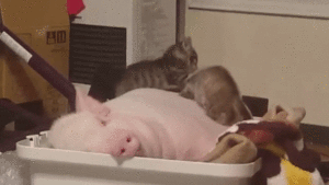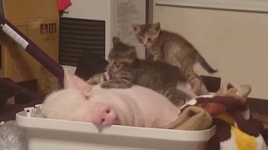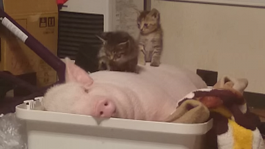 ブタさんベッドで、無邪気に遊ぶ子ねこ兄妹。