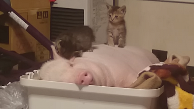 すると、ひとりがブタさんのお耳に顔を突っ込み…