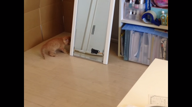 鏡のなかに動く何かを見つけたひろしくん。