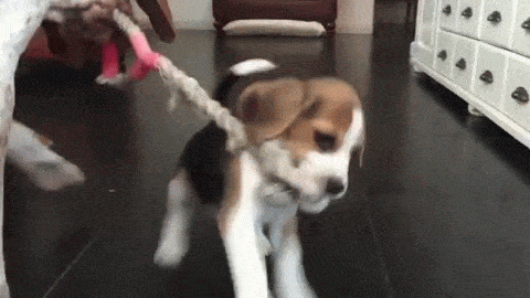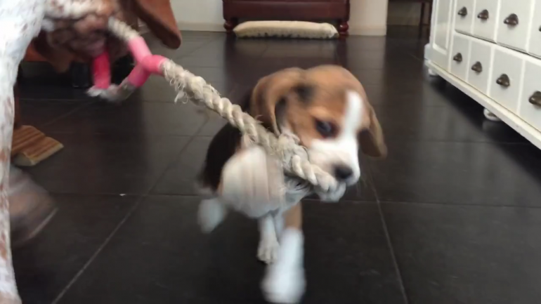 あっさりとロープごと持っていかれるビーグルちゃん(´Д⊂ヽ