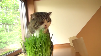 頑張ったご褒美(?)に猫草を食べるまるくん。