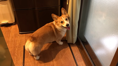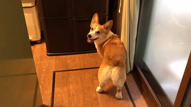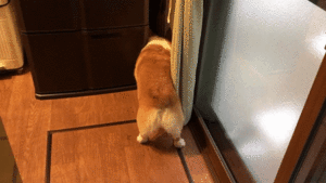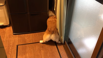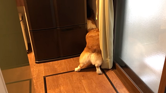 冷蔵庫のすみっこに顔をいれる福くん。