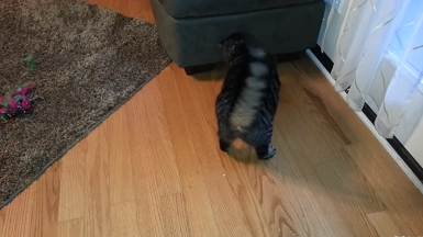 ソファの下に退避する、子ニャンコ。
