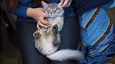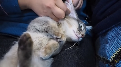飼い主さんの膝の上でくつろぐにじまるくん。