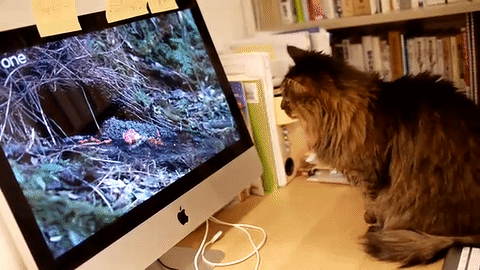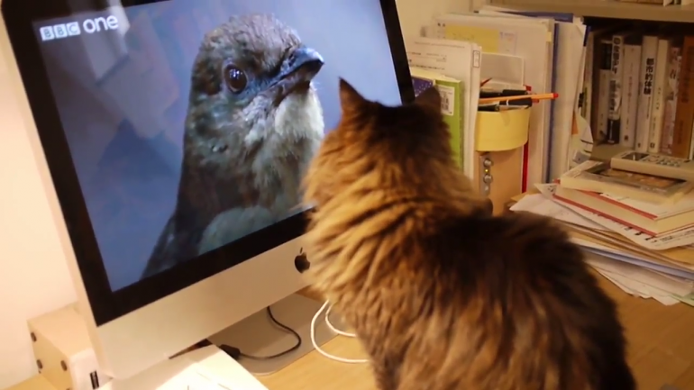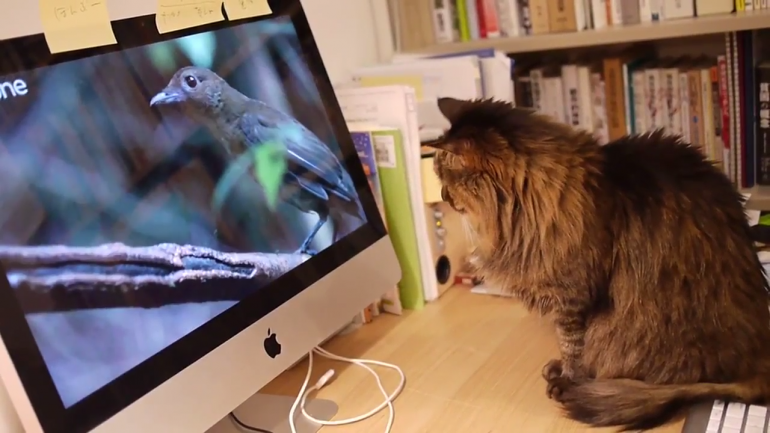 PC画面に映る小鳥さんをみつめるおはぎさん。