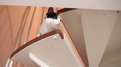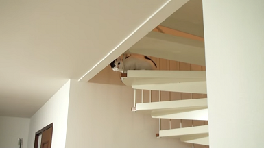 階段から何かをじっと見つめるシイちゃん。
