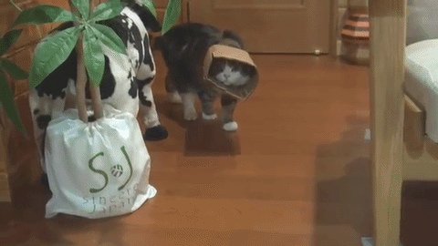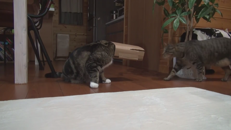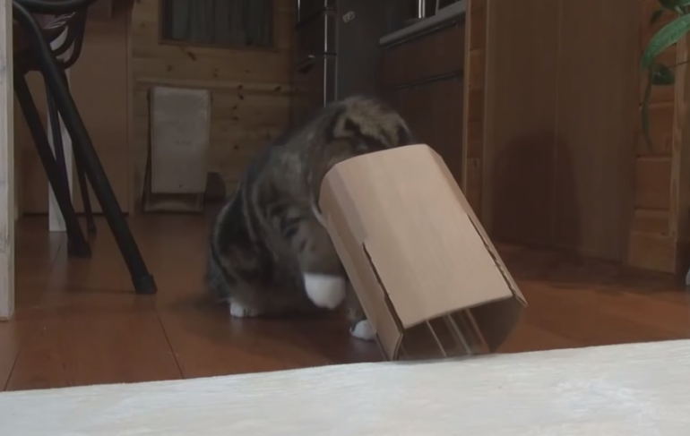 ダンボールをかぶりながら堂々と歩き回るまるちゃん。