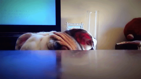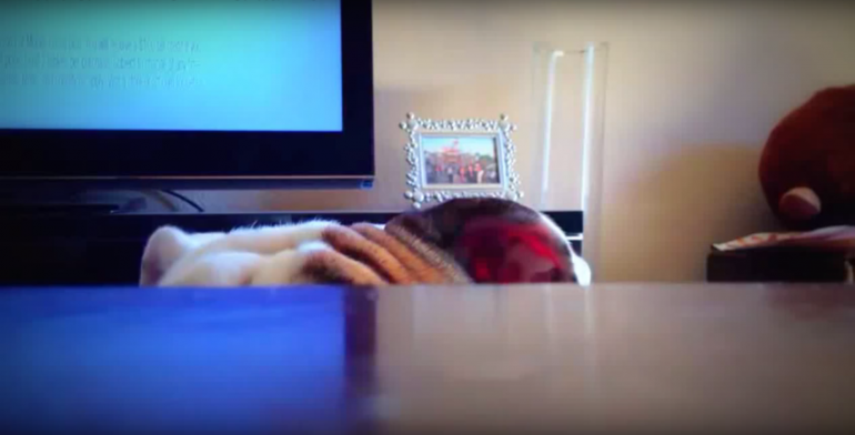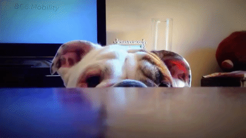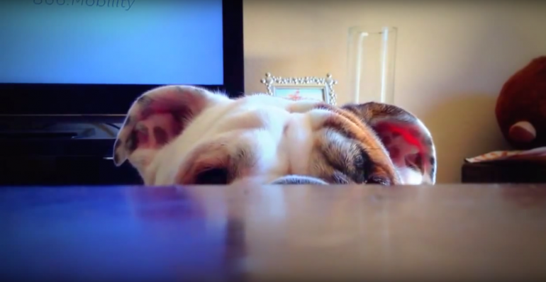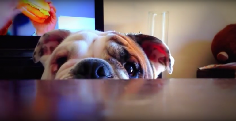 テーブルの向こう側に隠れているのは、ブルドッグのベニーくん。