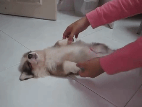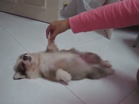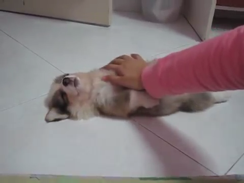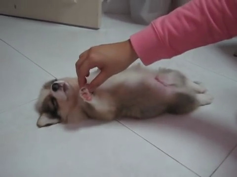 あおむけになってスヤスヤ眠っている小さなコーギーちゃん♪