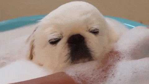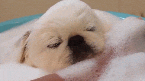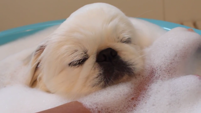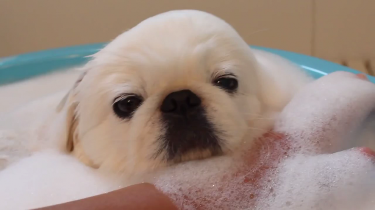あわあわお風呂にとっぷり浸かっているペキニーズのわんちゃん♡