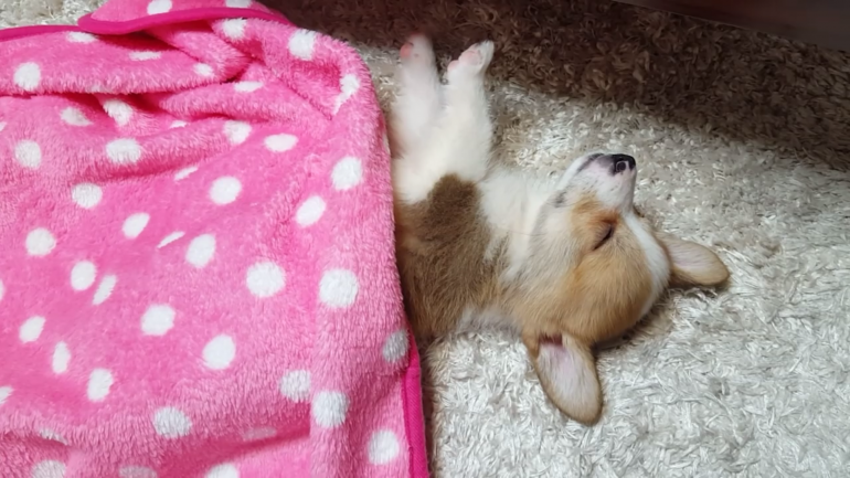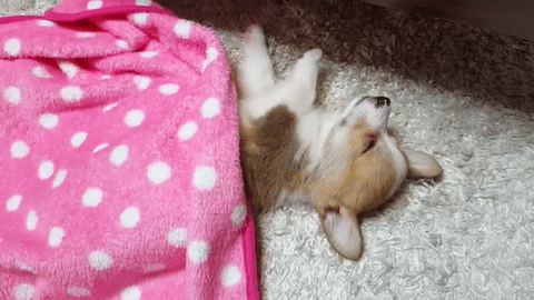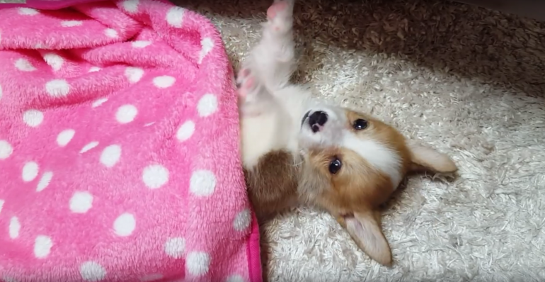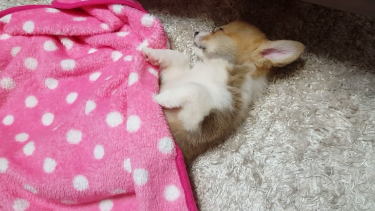 ピンクのブランケットをかけた小さなコーギーのワンちゃん☆