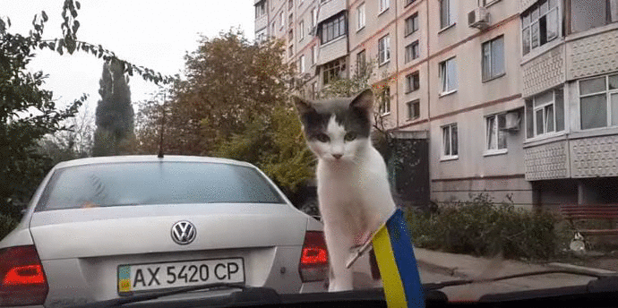 車のボンネットの上に乗ったハチワレのねこちゃん。