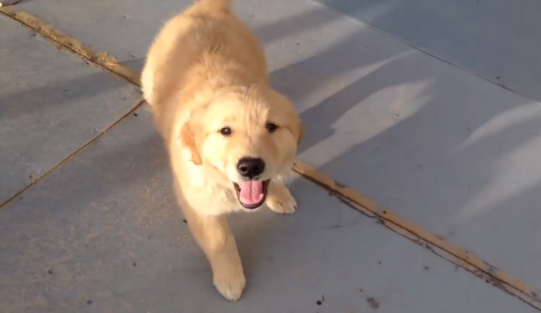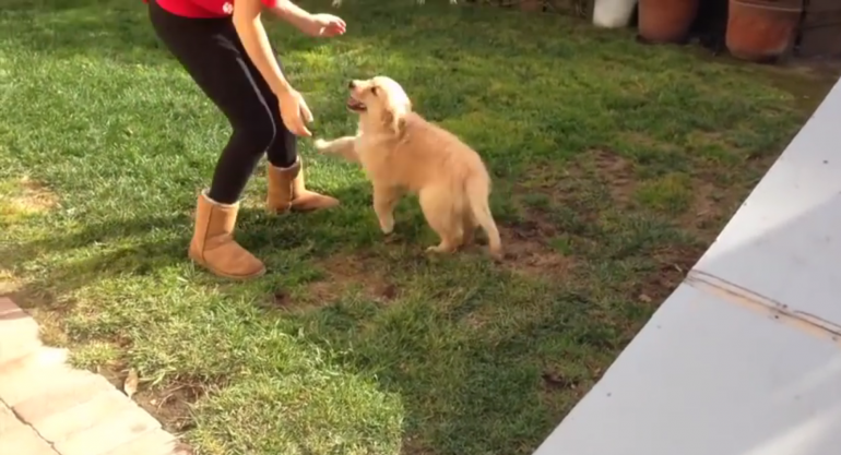 下におりてきた飼い主さんのもとへ駆けよるワンちゃん。