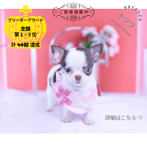 チワワ専門犬舎で25年ほどになります。ドッグショーに出陳しながらショー会場へ足を運び、10数年勉強してまいりました。そしてスタンダードに基づき自分の思うようなチワワの作出に力を入れ、イギリス・アメリカのチャンピオンの子を親犬にもつ自家繁殖チャンピオン犬を基礎に、スタンダードを重視しながら健全で血統・犬質にこだわり、骨格構成の美しい上品で華のある可愛いお顔、フレンドリーなチワワの作出に努めています。