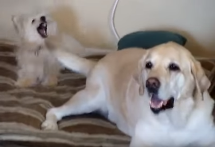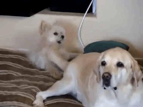 奥にいる小サイズわんこの顔面にクリーンヒット…っ!?