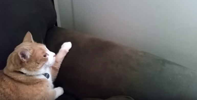 すると、のんきに楽しむ茶白にゃんこの特等席前方に謎の影が・・・